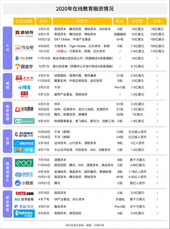 下图是“识微科技”对2020年在线教育融资情况的不完全统计(未包含猿辅导12月的3亿美元融资和作业帮的16亿美元融资)。