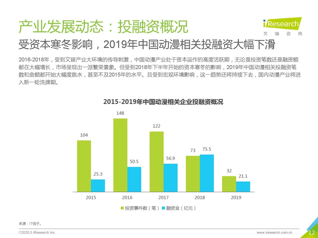 纵观近几年我国动漫相关企业投融资金额及投融资事件数可以发现,其一直表现出逐年下降的态势。据艾瑞咨询的数据显示,2016年我国动漫相关企业投融资事件148起,投资金额50.5亿;2017年投资事件122起,投资金额56.9亿;2018年投资事件73起,投资金额75.5亿;到了2019年,投资事件仅为32起,投融资金额为21.1亿元,均同比大幅下降。