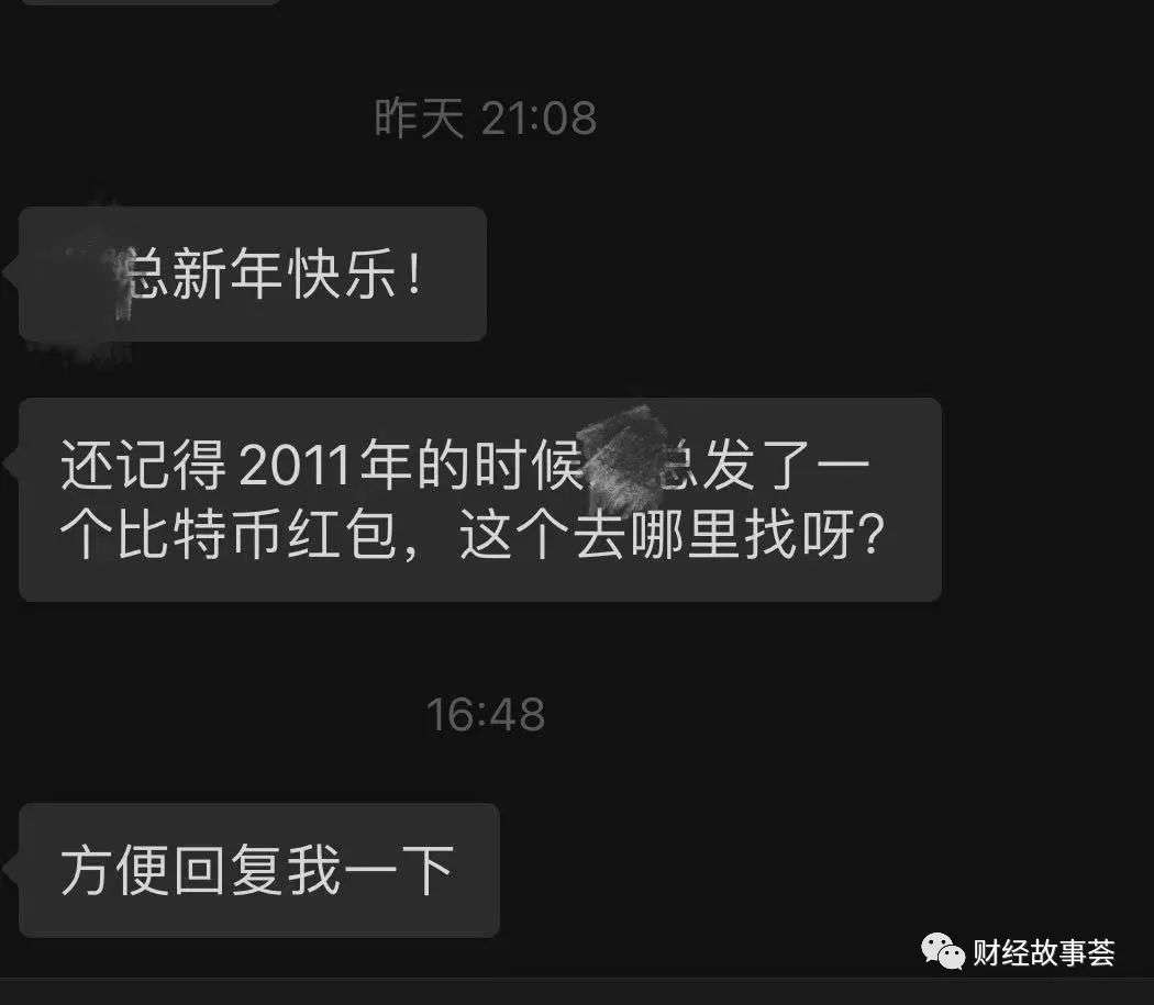 他知道,“新年快乐”的祝福可能是开场的铺垫,下一句才是关键——“还记得2011年的时候您发了一个比特币红包,这个去哪里找呀?”