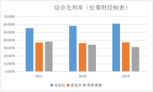 报告期内,倍轻松综合毛利率分别为55.29%、58.19%、60.93%,逐年增高。而行业龙头奥佳华过去三年的毛利率则为37.00%、36.26%、37.22%,上市公司荣泰健康过去三年的毛利率则为38.22%、34.07%、31.28%。