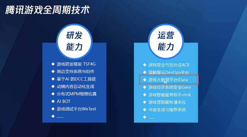 目前,腾讯游戏技术中台提供的能力包括:研发能力、运营能力。