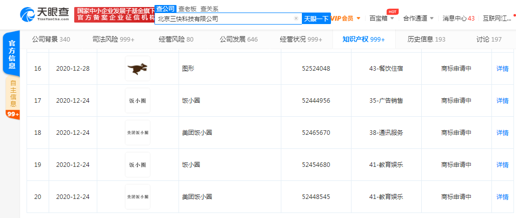 根天眼查App信息显示,近日,美团关联公司北京三快科技有限公司申请注册多个商标,其中包括“饭小圈”、“美团饭小圈”等商标,国际分类涉及通讯服务、社会服务等,商标状态均为“商标申请中”。