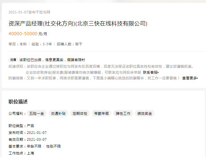 与此同时,1月7日,北京三快科技有限公司在拉勾网发布了一则资深产品经理招聘信息,并在岗位职责中要求:“负责休闲娱乐业务玩乐场景的社交化产品创新、构建年轻群体在密室、剧本杀、桌游、新奇潮玩等场景的社交分享、拼场等产品和运营体系,为社交化方向的业务增长指标负责。”