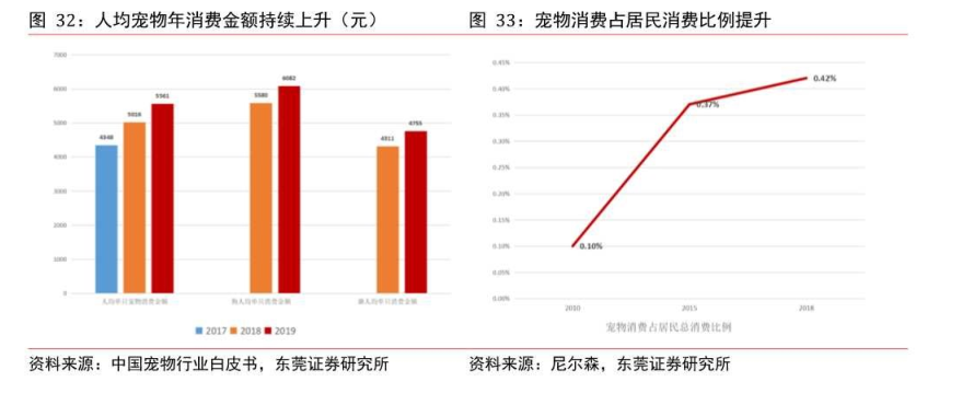 另外,从消费支出端看,宠物消费金额持续上升,热度不减。从2017年至2019年,人均单只宠物消费金额从4348元上升至5561元。宠物消费占居民消费的比例从2010年的0.1%上升至2018年的0.42%。