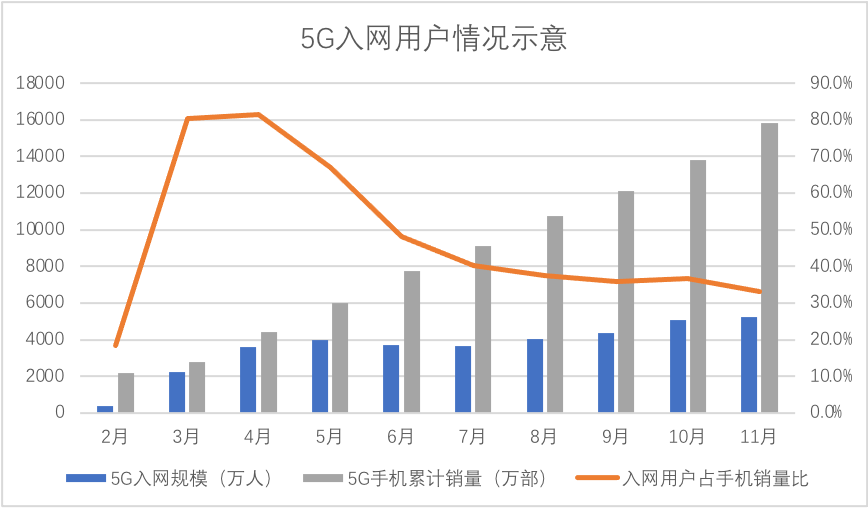 若剔除以上因素,整体判断:2020年5G手机的增长远大于入网用户情况,且5G入网用户并未随手机销量增加而提高渗透率,甚至在11月渗透率还有下行的压力。