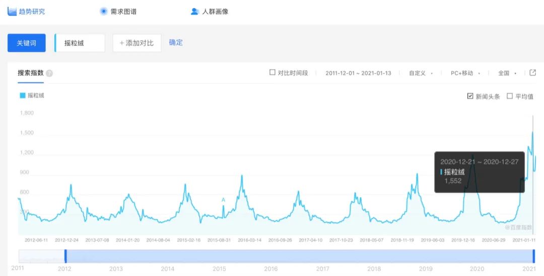 根据百度指数,摇粒绒的热度随着冬季的到来总会有一小段时间的上涨,但峰值不高、较为稳定。直至2019年、2020年年底,出现了历年以来的两个高峰,这与几个大联名的推出时间高度吻合。