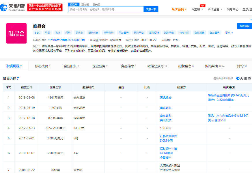 据天眼查APP显示,唯品会成立已有近12年,是一家名牌折扣特卖电商平台,旨在为中国消费者提供优质、受欢迎的品牌商品,而唯品会也正是依靠走这种小众化电商路线,成功于2012年在美国纽约证券交易所上市。