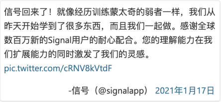 1月17日,Signal方面也从此前的巨大“惊喜“中缓过劲儿。公司官方发布推文表示:自己已从困扰服务器能力超过一天的宕机中断中恢复过来了。但是该公司也发出了一个小警告,由于服务器宕机和服务中断,过去这一天内的”断片“可能会导致一些信息残留错误,例如丢失消息内容,接下来的应用更新将自动解决这些问题。