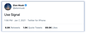 于是乎,一直看小札不顺眼的埃隆·马斯克(特斯拉CEO)在1月7日发了条推文:用“信号”吧。