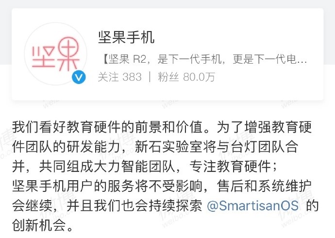 昨天下午,坚果手机官方微博承认,原锤子科技团队组建的新石实验室将会和与教育硬件团队合并,共同组成大力智能团队。合并后的硬件团队将着重于教育领域,主打的坚果手机及TNT显示屏业务将停止研发。这意味着,我们可能再也看不到坚果手机了。