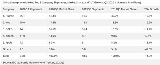 在市场总量缩水后,用户反而会更向头部品牌聚集,即市场内卷。如图所示,尽管因为疫情原因,大部分厂商出货量有所下滑,但是在小米、苹果等厂商逆势增长的情况下,本就不多的Others份额被进一步瓜分,从去年的5.1%下滑至2.5%,小型厂商的生存空间严重缩水。