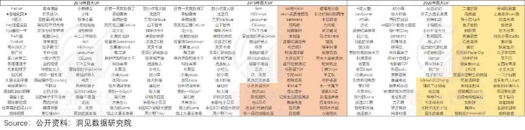 备注:橙红色部分是2019年较2018年新进榜的百大UP,黄色是2020年较2019年新进榜的UP主,排名不分先后。