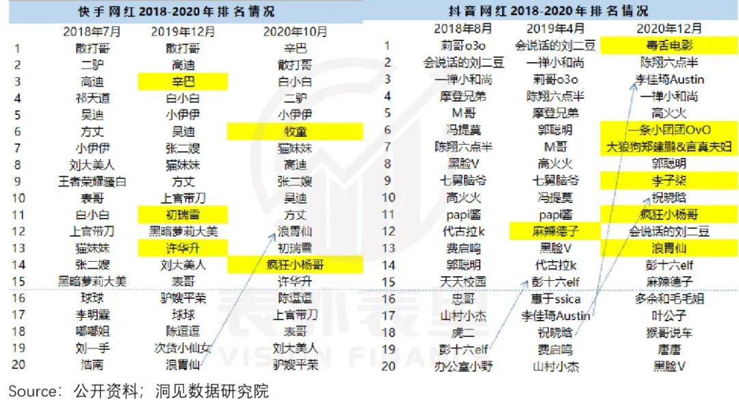 抖音虽然2019年对比2018年,TOP15红人基本没变,但2020年TOP20红人整体出现了“大换血”。