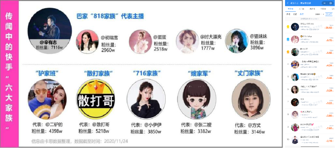 比如,上榜快手直播带货排行榜TOP10的主播中(上图右),有4位来自“辛巴家族”。