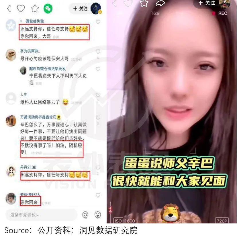 比如,辛巴快手账号的最新申明动态下,粉丝仍是一水“等你回来”的留言和支持;辛巴的徒弟们有的直播中说辛巴近况,有的则诉说辛巴的不易,为辛巴争取粉丝关注。