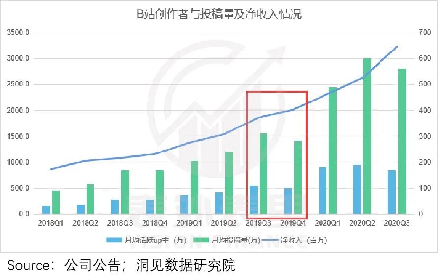 2019Q3-2019Q4,月均活跃UP主数量出现下滑,B站的月均投稿量同步下滑,同时平台的收入涨幅也有所收窄。