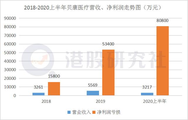 财报显示,2018-2019年,贝康医疗的主营收入分别约为3261万、5569万,2020年上半年,营收为3217万,同时净利润方面,也分别亏损1.58亿、5.34亿和8.08亿。两年半的时间,贝康医疗亏损额累计高达15亿元。