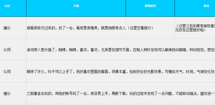 锌刻度看到,在小鱼提供的样例上还将评论详细地分为了“认同”、“建议”、“评价”和“拉踩”等多个类型,并且在每条文案后还留用审核人员提修改意见的区域。