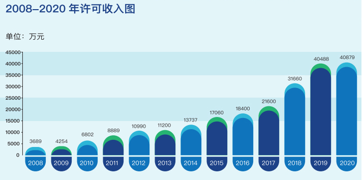 从大趋势来看,自2008年以来,音著协的许可收入都是一路走高的,其中增长最快的则是2018年和2019年,分别增长10060万元、8828万元,增幅46.57%、27.88%。