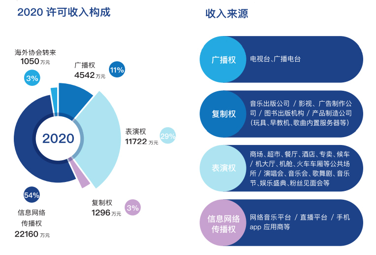 2020年,音著协的总许可收入40879万元,基本上年的40488万元持平。从各项数据来看,信息网络传播权占比54%,达22160万元;表演权占比29%,达11722万元;广播权占比11%,达4542万元;复制权占比3%,达1296万元;海外协会转来3%,达1050万元。可以看到,音著协的收入大头还是信息网络传播权,这与近年来各大音乐平台、直播平台的正版化不无关系。