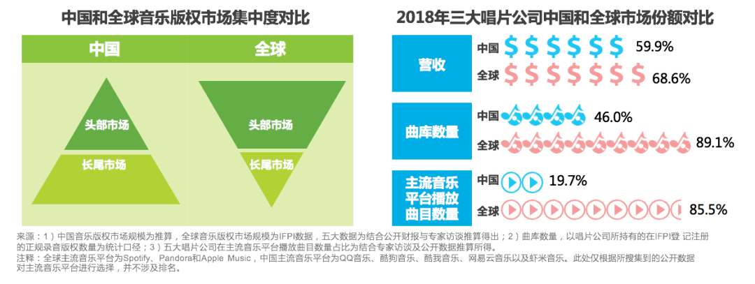 据艾瑞数据显示,三大唱片公司在全球录制音乐市场的头部市场占比高达89.1%,而在国内,三大唱片公司在头部音乐市场的占比只有46%,呈现出一定特殊性,版权市场集中度较低。