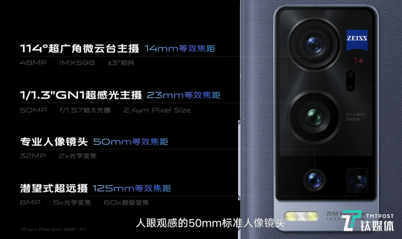 这套vivo蔡司联合影像系统包含采用GN1传感器的超大底镜头、超广角微云台镜头、专业人像镜头和超长焦潜望镜头,具备高分辨率的特性,可改善色散、眩光、紫边和鬼影等等各类光学问题。