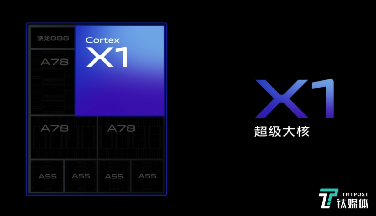 高通骁龙888是行业内第一款正式采用Cortex-X1超级内核的芯片,其面积足足是A78的2.3倍,峰值性能较A78提升30%,即便是单核性能也提升了 22%,机器学习能力更是达到了 A78 的两倍。而Adreno 660 架构的 GPU图形渲染速度提升了35%,能效了提升20%。