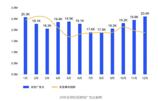 新品高发必然导致买量推广投入的增加。根据Nativex发布的《2020年全球移动市场买量白皮书》,2020年在投游戏广告主数量比2019年整体增长7.8%,其中Q1增幅最为明显,为32%;投放广告主最高出现在20年1月,累计超2万,随后波动下降直到Q4才有提升;从投放素材量上看,Q1和Q4是主投的时间段。