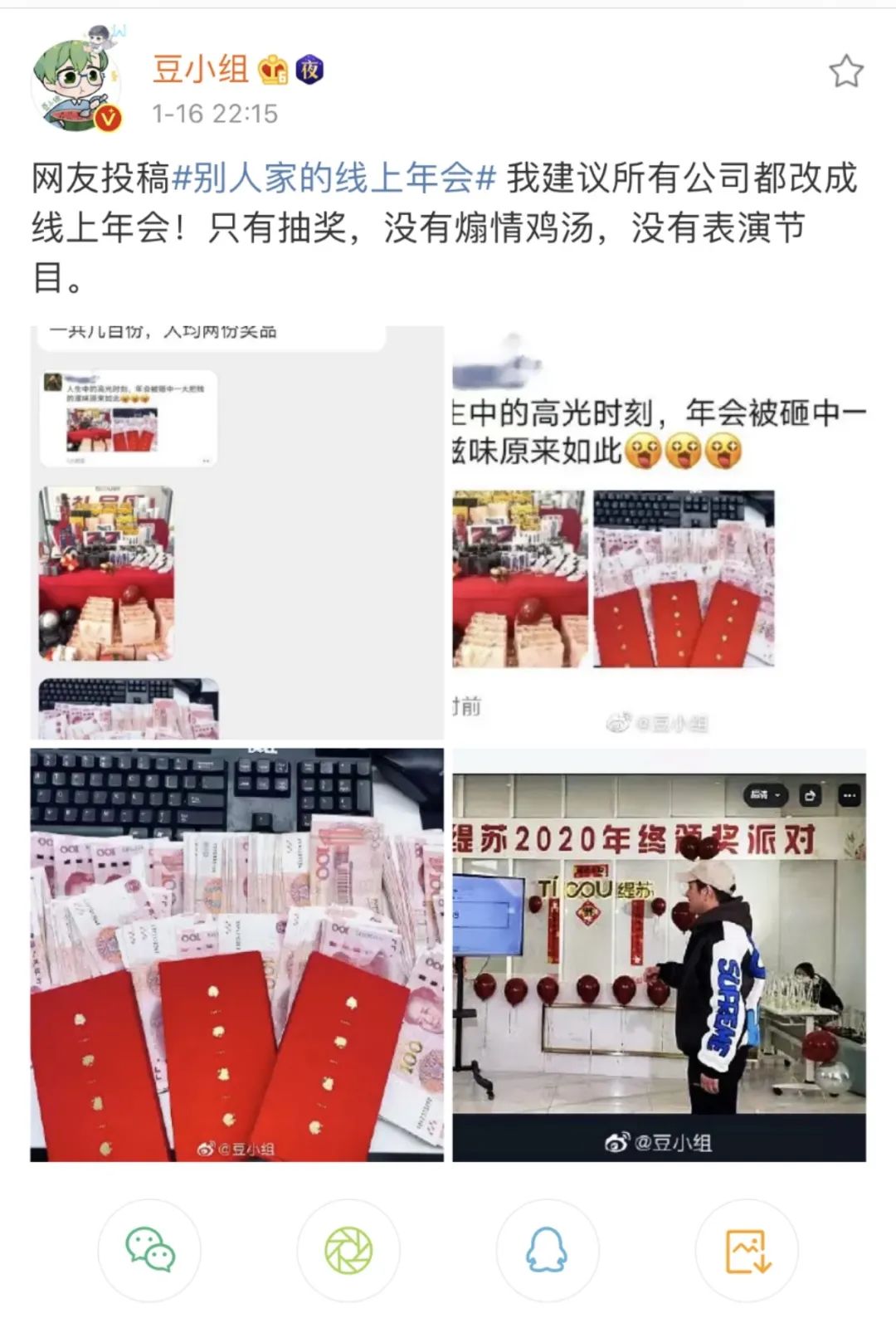 还有一些公司,选择部门一起观看直播,既保证了安全性,又不失热闹感。杭州一家传媒公司则选择简单粗暴的方式,没有表演节目、没有煽情鸡汤,而是直接线上抽奖,人均两份奖品,引得微博粉丝一阵羡慕。