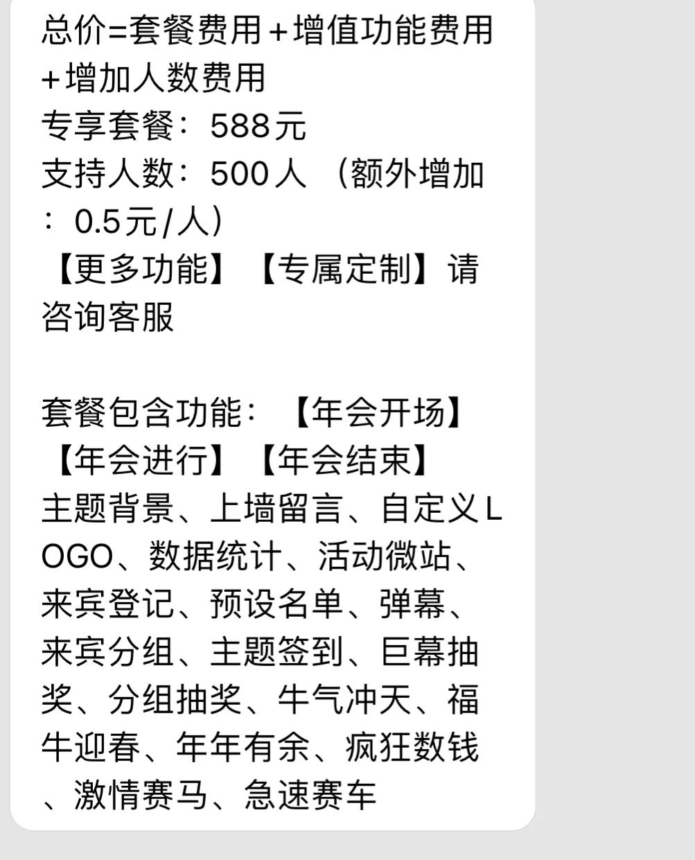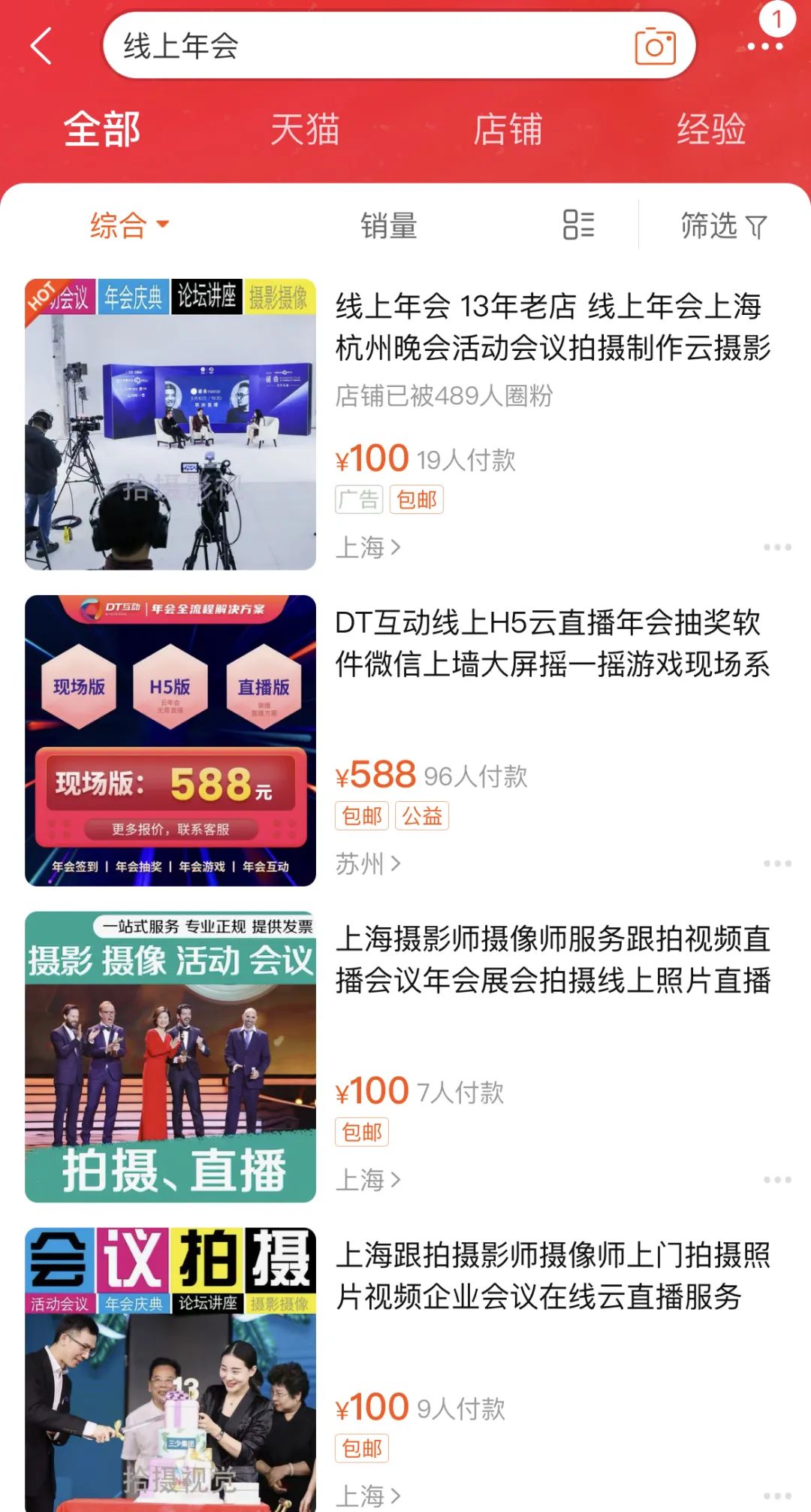 「电商在线」发现,有许多做拍摄和直播服务的商家,直接上线了“线上年会”服务,服务费用根据机位数的需求,从3000元到上万元不等,因为线上年会对场景设计和搭建的需求小了很多,他们也可以同时提供场地搭建、灯光、音响等服务,再根据需求情况定价。
