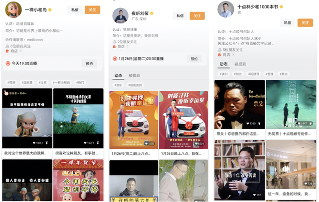 但人们视野里更熟悉的视频号大V大部分还是微信生态的“既得利益者”——已经积累起私域流量池的创作者,在视频号诞生之初就迅速涌入,并且有一部分成长为了如今视频号生态的头部力量。比如一禅小和尚(MCN机构大禹网络旗下账号)、夜听刘筱(“夜听”创始人)、李筱懿(“灵魂有香气的女子”创始人)、十点林少和1000本书(“十点读书”创始人)、私域肖厂长(星辰教育创始人),他们有一个共同的特点,就是在进入视频号之前就已经建立起了一定的IP属性。