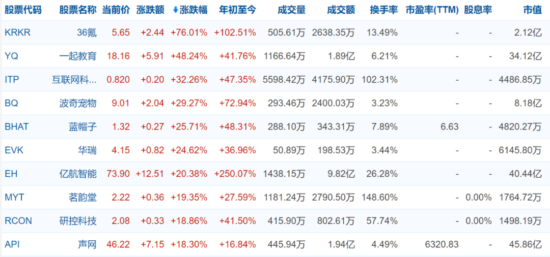 涨幅前三名分别为36氪(暴涨76.01%)、一起教育(涨48.24%)和互联网科技包装(涨32.26%)。跌幅前三名为中国天然资源(跌21.89%)、富维薄膜(跌11.54%)和第九城市(跌10.87%)。