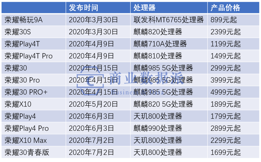 据商业数据派统计,荣耀在2020年共发布12款手机,覆盖899元-5499元价格区间,其中既有采用联发科处理器的中低端品牌手机,也有采用麒麟芯片的中高端手机,但采用麒麟芯片的产品相比联发科处理器产品拥有更高的产品定价。
