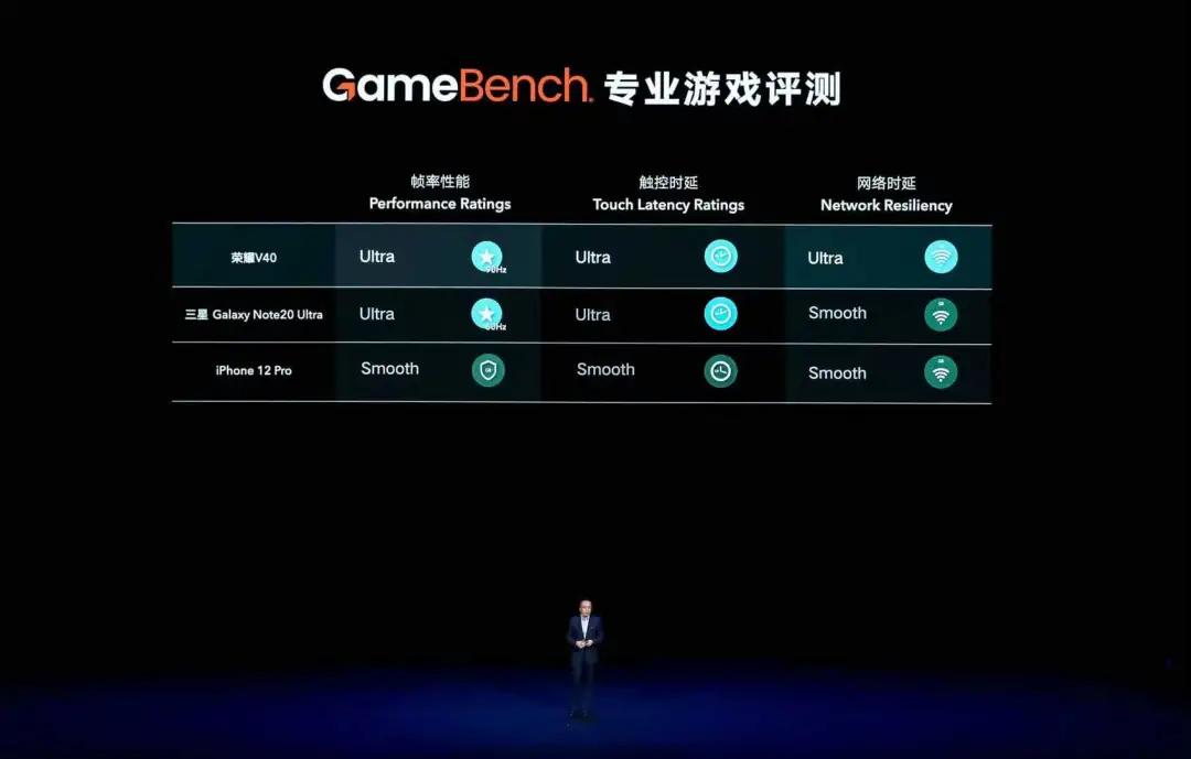 此次荣耀V40在PPT展示环节主要对标的机型,选择了三星Note 20 Ultra、iPhone 12 Pro,与OPPO Reno 5 Pro,既没有以前常见的小米,更没有出现华为,并且对芯片还有意做了淡化处理,全程未做介绍。