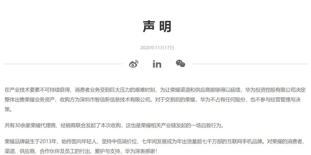 去年11月17日,在“915”封锁禁令生效并执行的重压之下,华为决定整体出售荣耀业务资产,收购方为深圳市智信新信息技术有限公司。