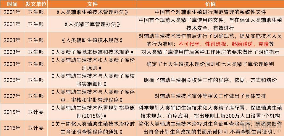 国内对辅助生殖行业的系统性规范从2001年颁布首个《人类辅助生殖技术管理办法》开始,在该则管理办法中,首章总则就强调了“禁止以任何形式买卖配子、合子、胚胎。医疗机构和医务人员不得实施任何形式的代孕技术”,为中国的辅助生殖行为划清了基本实施边界。