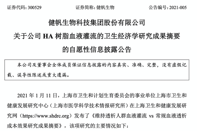 1月11日,血液灌流龙头——健帆生物发布了一篇《关于公司HA树脂血液灌流的卫生经济学研究成果摘要的自愿性信息披露公告》。