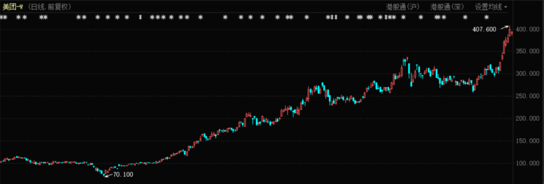 260港元,300港元,350港元,400港元。南下资金的能量之大,让所有人瞠目,美团作为一个优秀的互联网公司,价值潜力被进一步发掘了出来。