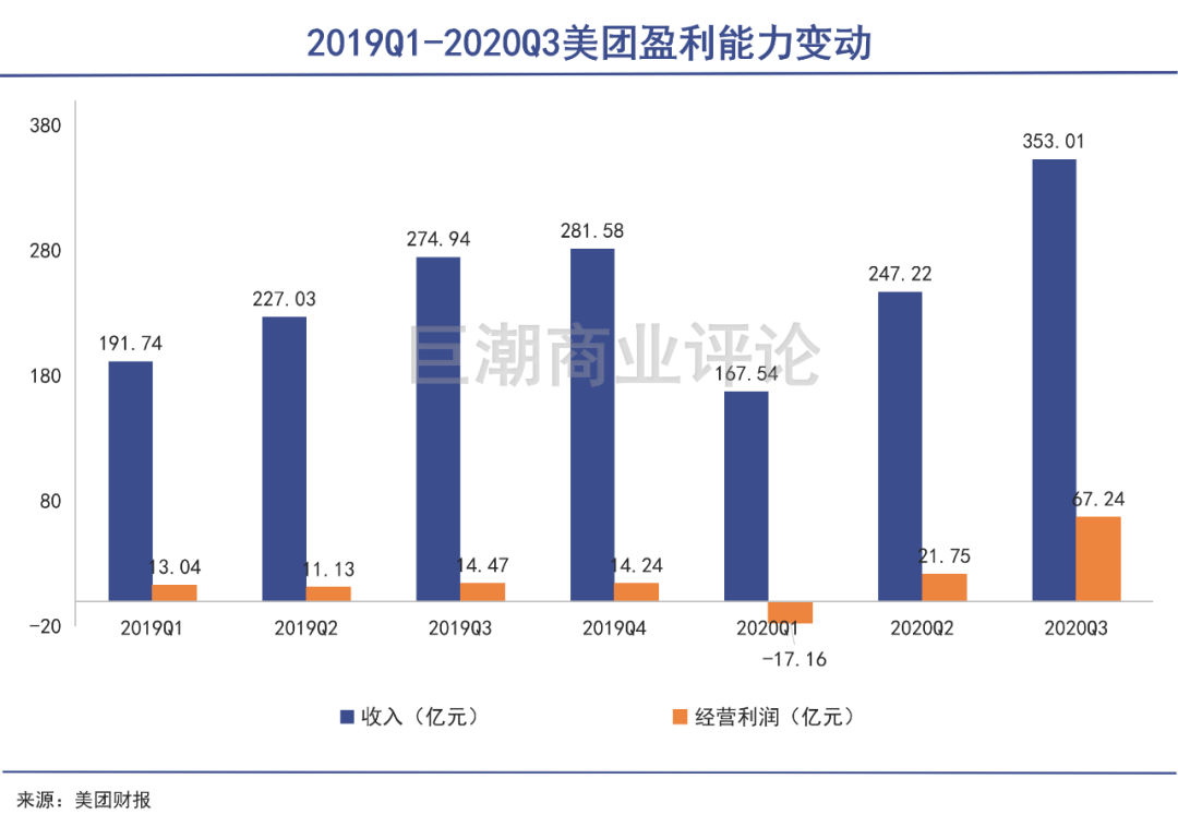 2020Q3,美团交出了一份亮眼的财报,营收同比增长43%,经营利润同比增长209%,这也是推动美团股价上涨最重要的基本面来源之一。