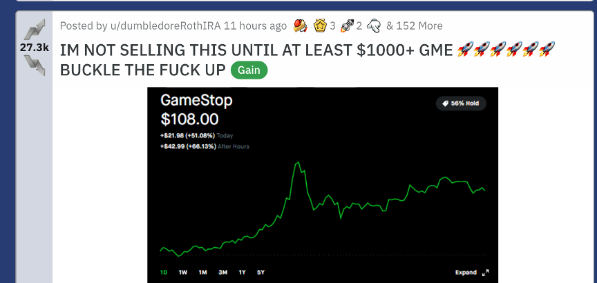 有网友在周一发文,号召大家稳住阵脚,要等到股价来到每股1000 美元以上再出售GameStop,目前已经有6000多条评论。