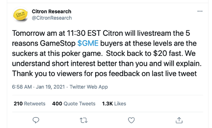 而所谓枪打出头鸟,正当双方酣战之际,美国最著名的做空机构之一香橼忍不住在Twitter上发了一条微博,表示将直播阐述看空Game Stop 的五个理由,并且言辞较为激烈地指出该股票的购买者都是这场扑克牌游戏中的输家,Game Stop 的股价将很快回到20美元。