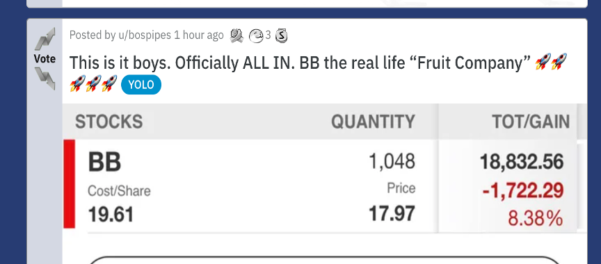 在Wallstreetbets上,有种很神奇的现象是,往往那些正儿八经分析股票现状与前景的发文没啥人看,但那种全文吼着“OMG,买它买它买它!”再配上满屏火箭的文章能得到一大票追随,大家都前赴后继地要all in。