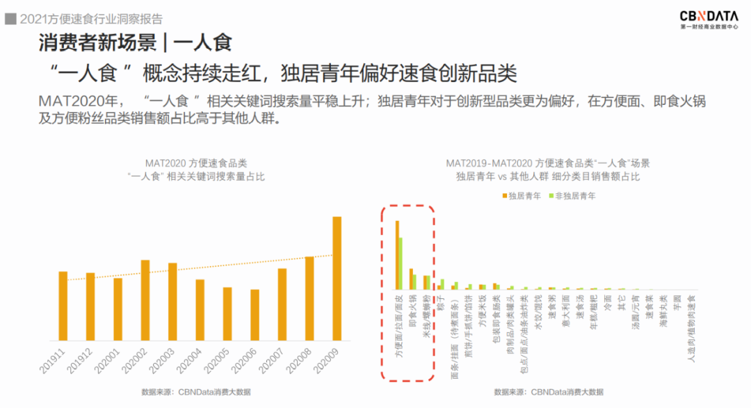 伴随着单身经济兴起的“一人食”,越来越多地成为当下年轻人的消费场景。根据CBNData《报告》,2020年“一人食”相关关键词的搜索量逐渐上升,许多餐厅也贴心地推出单人就餐隔间和一人份的菜单,让一个人吃饭不再是孤独而尴尬的事。而独居青年在家则更青睐方便面、即食火锅和方便粉丝等品类,他们在口味与品类选择上也更为专一,且最爱酸辣和麻辣味。