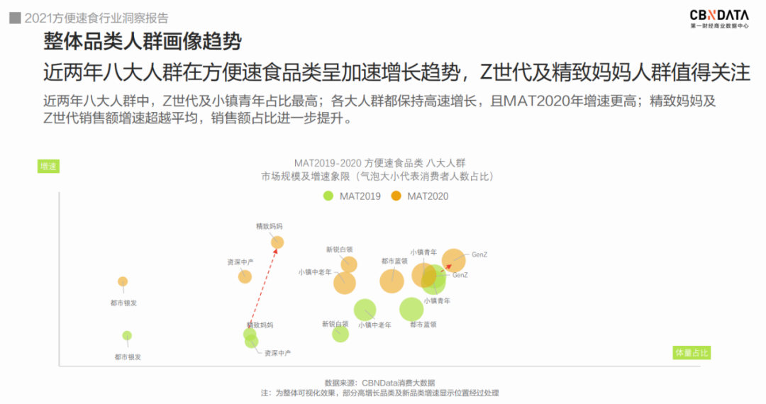 在Z世代、新锐白领、资深中产、都市银发、精致妈妈、小镇中老年、都市蓝领、小镇青年这八大消费群体当中,年轻的Z世代与小镇青年的方便速食消费占比最高,同时Z世代与精致妈妈凭借较高的增速引起关注。