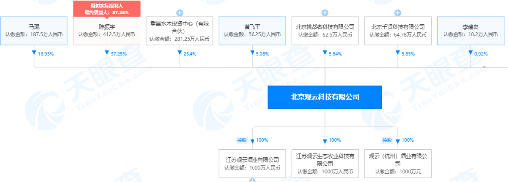 和此前元气森林入股的几家品牌一样,唐彬森和他的挑战者资本也早早在观云白酒内部打下了属于自己的印记。翻看天眼查上的观云白酒信息可知,目前北京挑战者科技有限公司持股比例为5.64%(62.5万元),位居第五大股东之位。