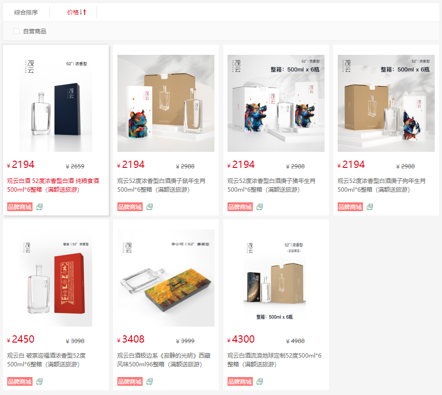 上文已经提到,观云与江小白的完全低度化不同。2014年以来,观云曾推出过多款产品,目前主打52度浓香型,单瓶价格在443元-831元之间。这凸显了观云的一个缺点——除了面向互联网人群的各式特色外,它与一众老牌酒企的低度白酒价格差距并不大。