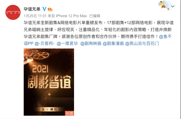 1月25日,华谊兄弟发布了2021年度剧集和网大的片单,其中包括17部剧集和12部网络电影。剧集方面既有主旋律、现实主义,也有甜宠和青春向的作品,类型丰富;网大则多是华谊自有电影IP的衍生开发。