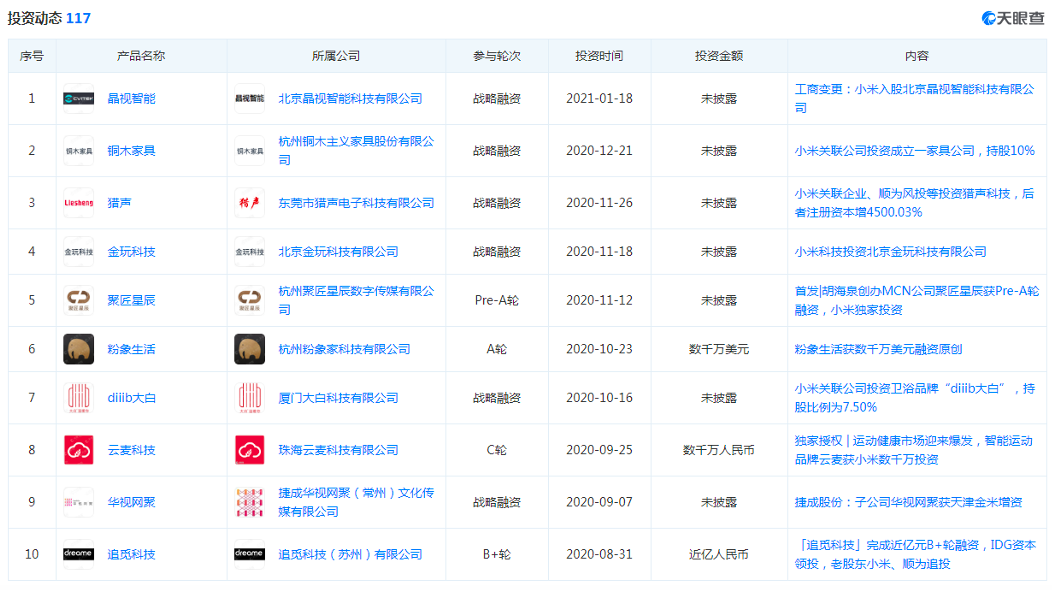 据天眼查APP显示,小米的投资动态中,有直播电商公司、家具公司等,也可以看出小米在商业生态方面的布局。