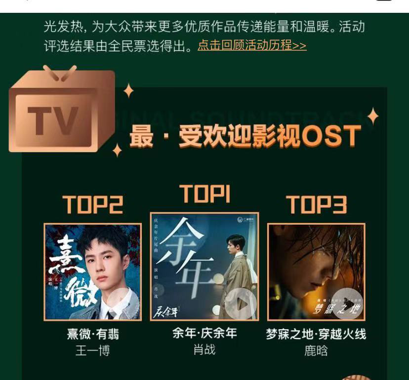 肖战凭借为电视剧《庆余年》演唱的主题曲《余年》,获得了腾讯音乐“2020影视OST人气大赏”最受欢迎影视OST评选的TOP1,迄今为止,这部作品在QQ音乐收藏量超过100万,评论数超过10万条。而TOP2是由王一博演唱的《有翡》主题曲《熹微》,TOP3为鹿晗为《穿越火线》演唱的《梦寐之地》。