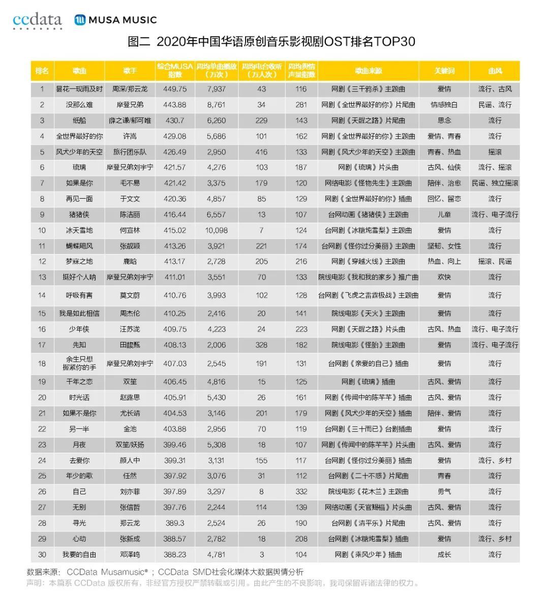 Musamusic大数据显示,与2019年相比,2020年MUSA100上榜歌曲中的OST占比整体下降11%,台网剧、电影OST占比均有明显下滑,网剧OST占比有所上升。2020年华语影视OST排名TOP10中,有7首歌曲来自热播网剧。